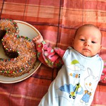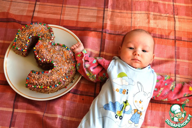 Каждую часть остывшего коржа смазать кремом, сложить друг на дружку и смазать верхний ещё раз. Пока второй корж печётся, эти успеют пропитаться кремом.