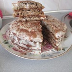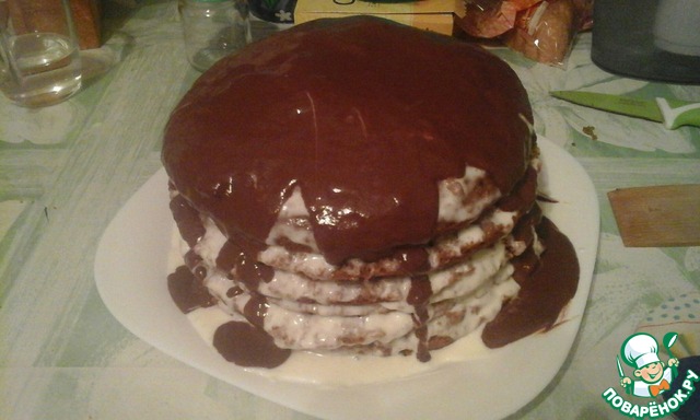 Повторить действия со вторым и третьим коржами. Постепенно собрать их вот в такой пирог. Сверху его тоже смазать кремом.
