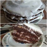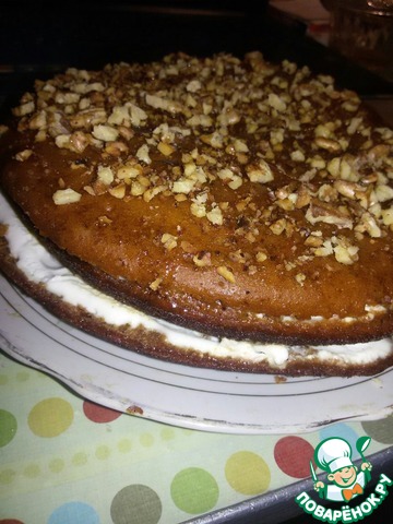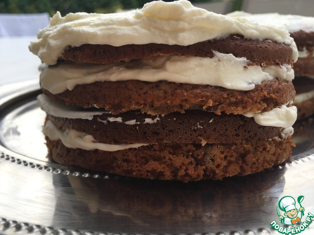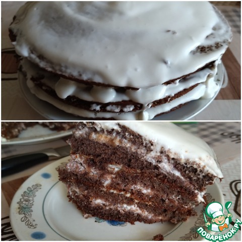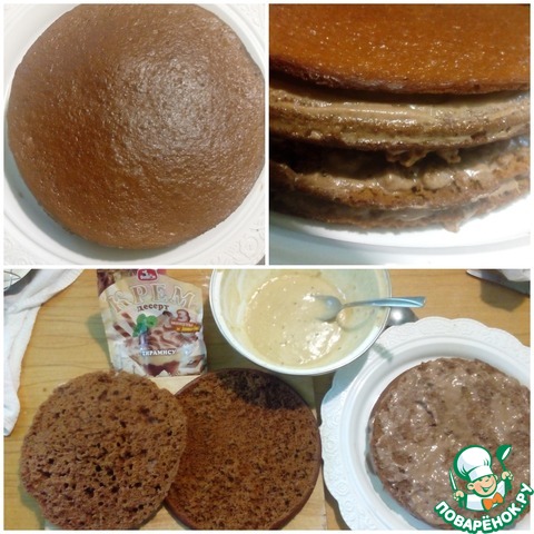 Корж достать из формы горячим и расслоить ниткой на два, дать немного остыть. В это время поставить второй корж.