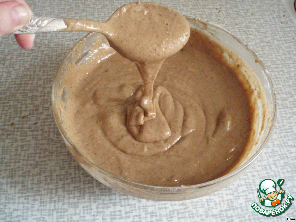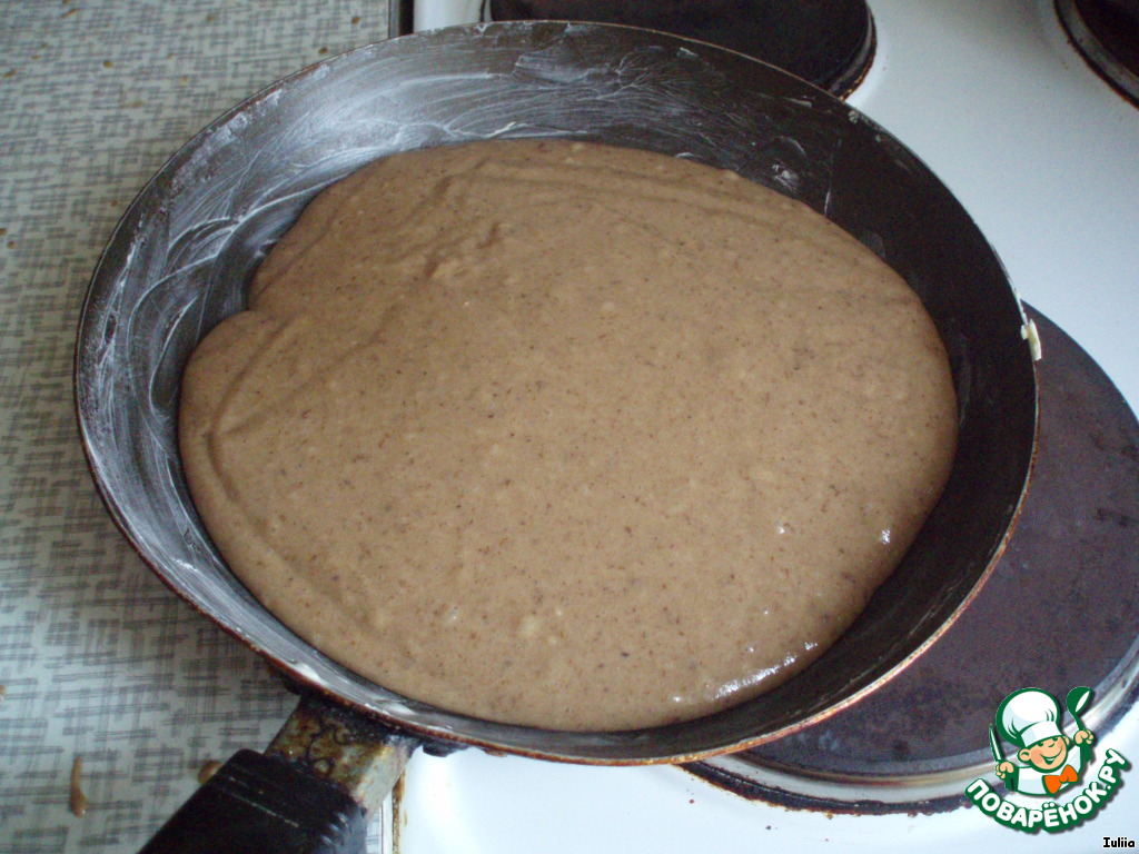 В смазанную жиром форму вылить 1/3 часть теста. Выпекать минут 20 при 180 С.