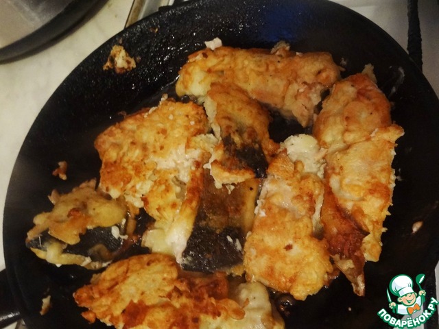 Далее всё как обычно в таких случаях - разогреваем в сковороде растительное масло (побольше, чем обычно при жарке), при помощи вилки (или двух) обмакиваем рыбу в кляр и жарим с 2-х сторон на среднем огне до золотистой корочки.