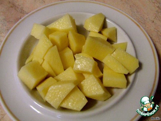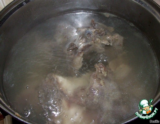 1. Готовим бульон (овощной или мясной). В моем случае я использовала мясо молодого кабанчика. Бульон получается не слишком жирный, что не мало важно, поскольку у нас будет предостаточно масла.