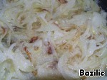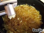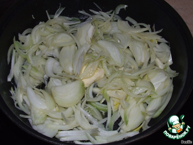 2. Режем полукольцами лук. На сковороду (или в кастрюлю с толстым дном) выкладываем сливочное масло, добавляем оливковое масло и лук, оставляем томиться на маленьком огне. Очень важно, чтоб лук не пригорел, его нужно время от времени помешивать. Время приготовления лука - не менее 40 мин.