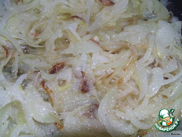 3. Когда лук начнет немного темнеть, мы добавляем тростниковый сахар (можно заменить обычным).