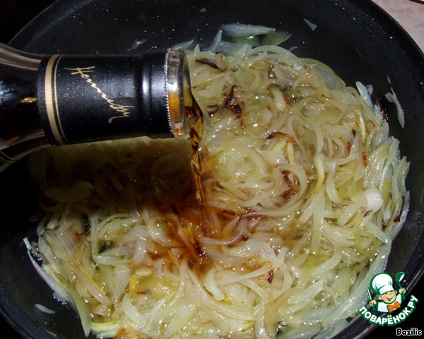 4. Через несколько минут добавляем коньяк. Сначала помешиваем минуты 2-3, затем накрываем крышкой. Процедуру необходимо повторить 2-3 раза.