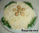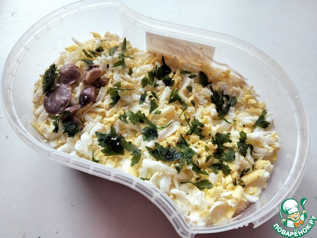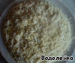 Сверху трем яйца на мелкой терке так, чтобы хорошо закрыть майонез.