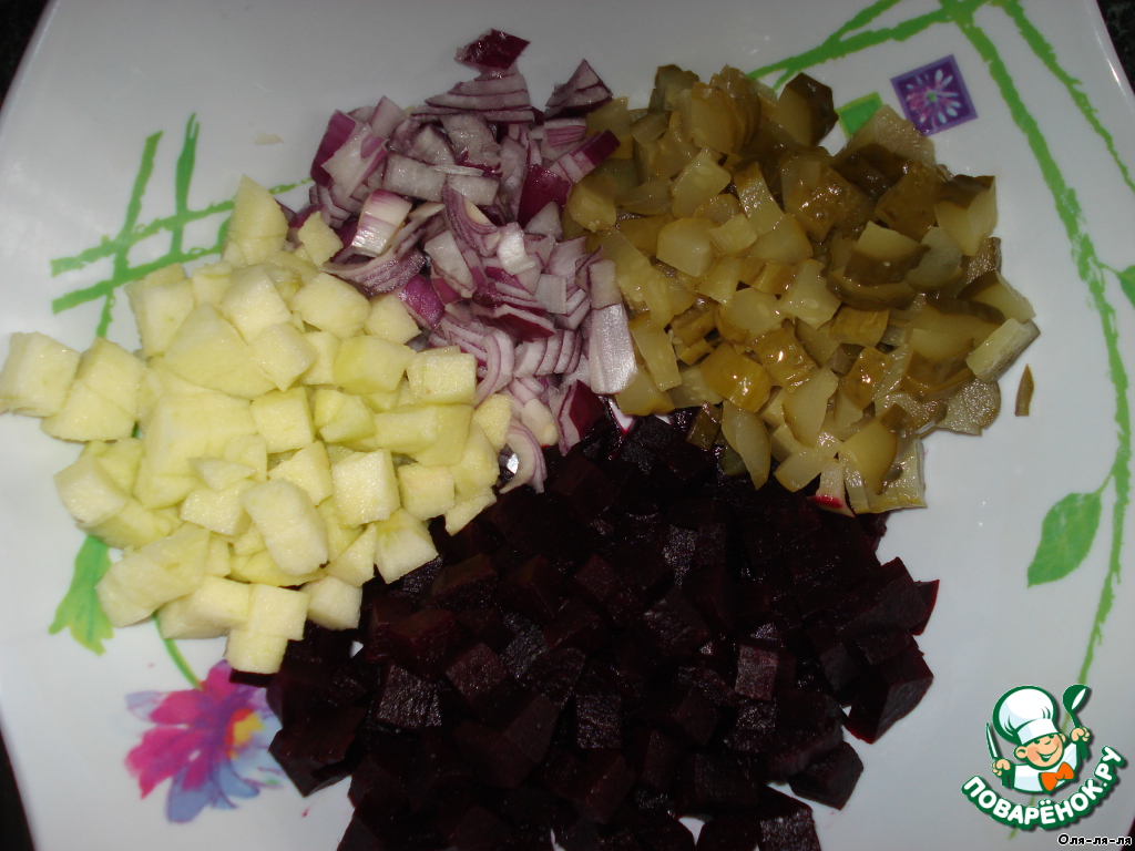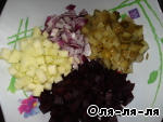 Нарезаем кубиком огурцы, яблоко, очищенное от кожи, лук и свеклу.