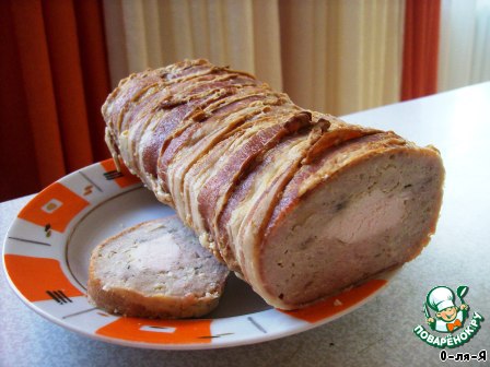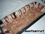 Заполняем форму остальным фаршем и укутываем полосками бекона.