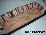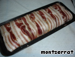Форму для пудинга смазываем маслом, выстилаем тонко порезанным беконом, края должны выходить за бортики формы.