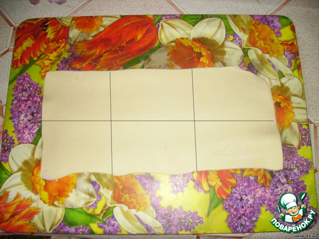 Берем пласт готового слоеного теста и разрезаем на 6 частей, каждый квадратик еще немного раскатываем.