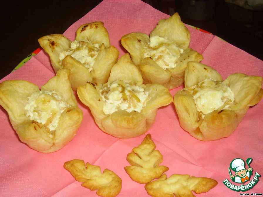 После запекания слегка полила творожную серединку яблочным вареньем. Цветочки получаются очень воздушными и легкими! Съедаются очень быстро.