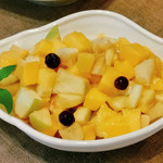 Фруктовый салат из банана, яблока, манго и горсти клюквы.