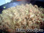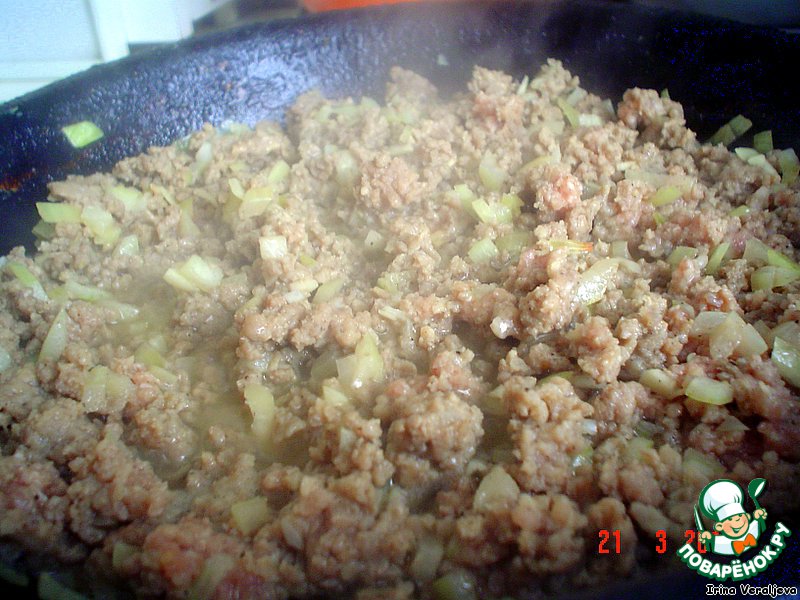 Мясной фарш поджарим с мелко нарезанным луком и чесноком. Добавим соль, перец, мускатный орех. -