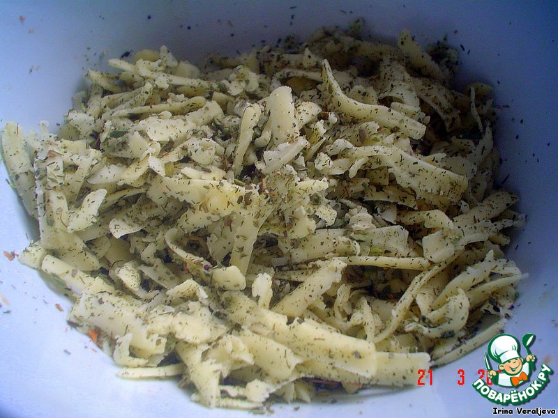 В миску натрем сыр, насыпем туда же всякую любимую зелень (можно сразу смесь типа "Прованские травы" или "Средиземноморские травы"). Перемешаем.