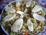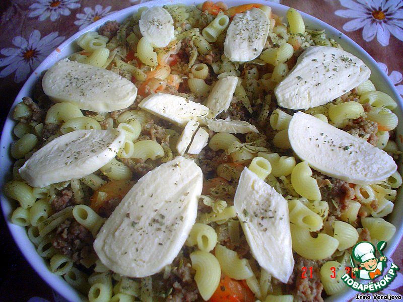 - сверху вторую часть макарон, колечки порезанного шарика моцареллы (присыпанного зеленью)