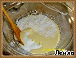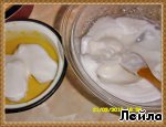 Отделить белки от желтков. Снять полученную массу с водяной бани и добавить желтки, тщательно перемешать. Дать массе немного остыть.