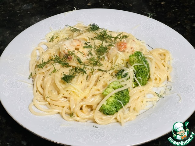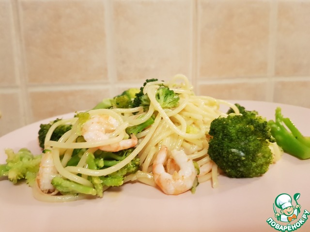 Рецепт «Спагетти с креветками и брокколи "Триколор"»: