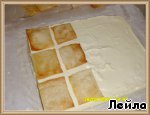 Нарезать тесто на квадратики. Лист кулинарного пергамента положить на форму, на пергамент выложить квадратики. Накрыть вторым листом пергамента и прижать их второй формой, чтобы при выпекании они не поднимались.