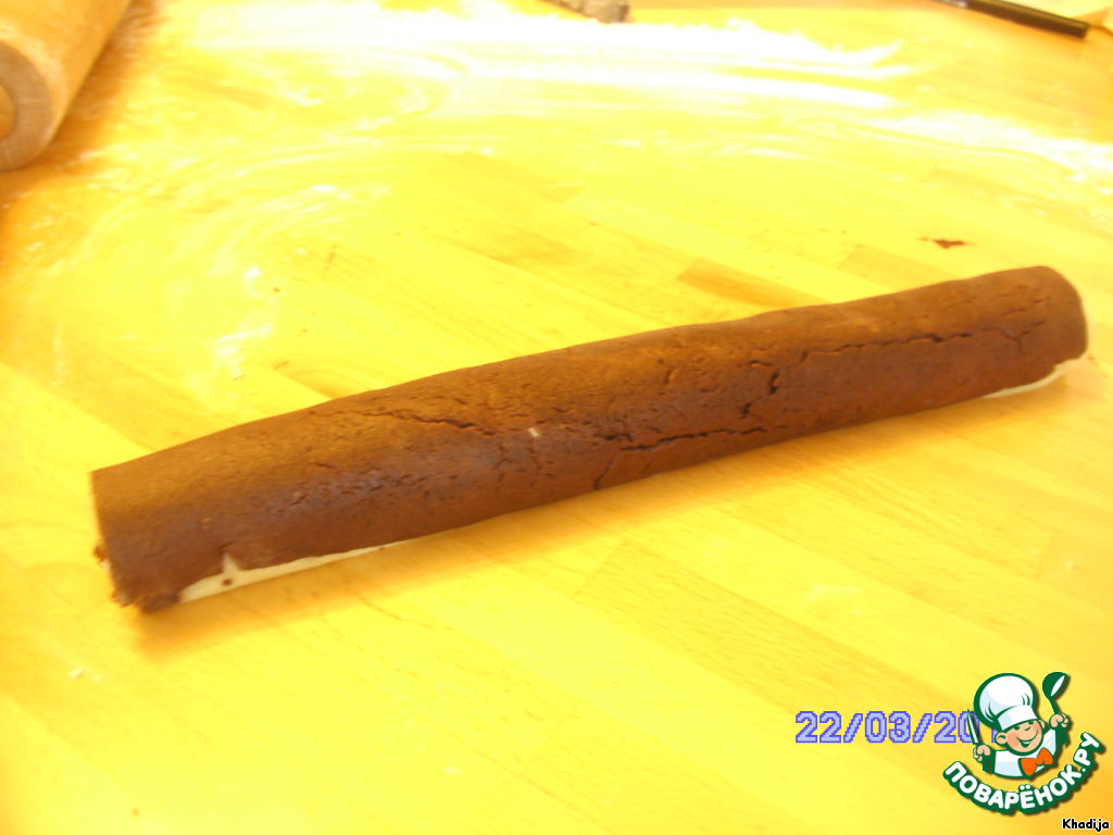 Раскатываем тесто в прямоугольник, смазываем белком и кладём 2-й слой. Сворачиваем трубочкой и на 30 минут в холодильник.