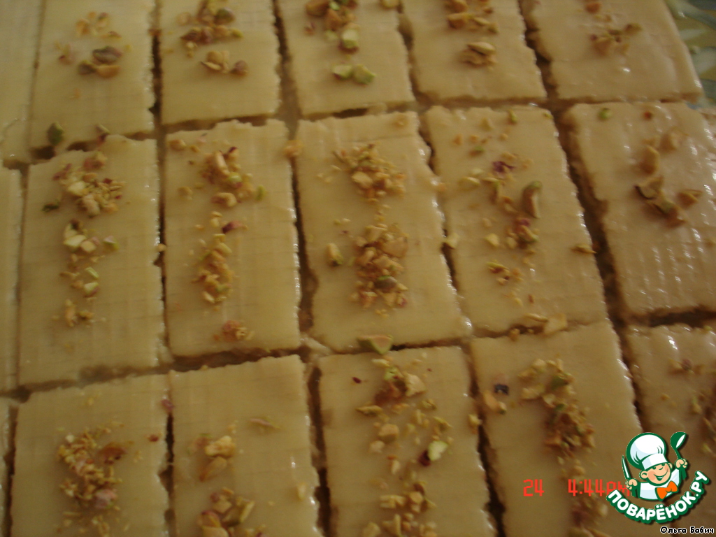 Разрезали на кусочки и полили растопленным на водяной бане шоколадом, присыпали порезанными орешками-фисташками.