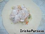 Тесто делим на небольшие кусочки, из каждого раскатываем тонкую лепешку диаметром 15 см. В серединку кладём капусту, сверху жаренный лучок, затем филе рыбки
