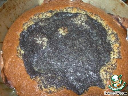 Форму застилаем пергаментом или фольгой, смазываем маслом, выливаем тесто, а сверху выкладываем мак, чтобы по краям осталась каёмочка из теста.