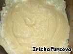 Тщательно перемешиваем смесь яиц с сахаром и майонезом с мукой, чтобы получилось тесто чуть гуще, чем на оладьи