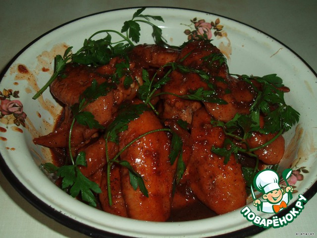 Готовые крылья уложить на блюдо, украсить петрушкой, полить соусом от тушения и подавать на стол.