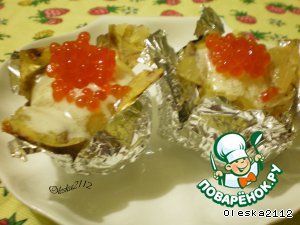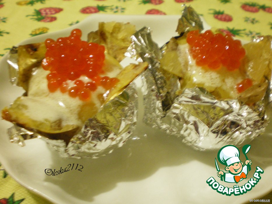 Вытаскиваем картофель. Делаем на каждом клубне надрез крест на крест. Немного раскрываем его. Затем перекладываем клубень на тарелочку для подачи, кладём чайную ложку сливок и сверху чайную ложку икры. (Икру можно любую, одинаково вкусно, проверено!!!) Получаем вот такой картофель без особых затрат усилий и времени! Смотрится на столе очень эффектно!