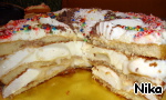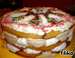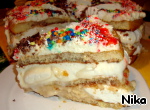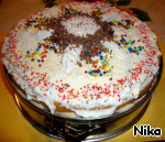 Торт для сладкоежек. Бисквит, зефир, желатин, творог... Много не съешь. Торт на любителя. Сахара только две столовые ложки сверху в сливочном креме. Почему так назвала этот торт... Он очень сладкий за счeт зефира. Разрезать на кусочки его весело, так как он без выпечки, а с желатином не очень хорошо режется.