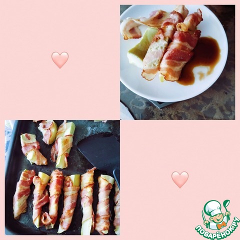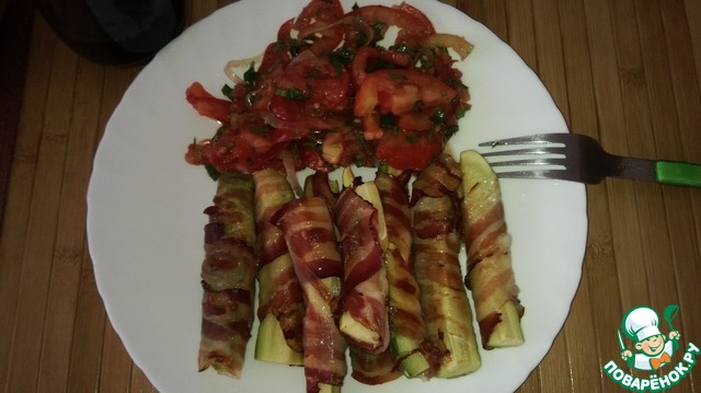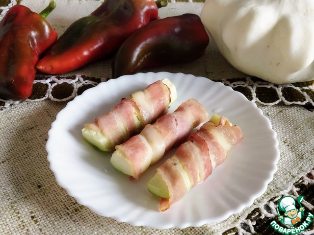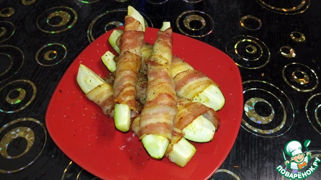 Каждый кусочек кабачка завернуть внахлест в тонкие полоски бекона.