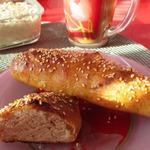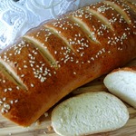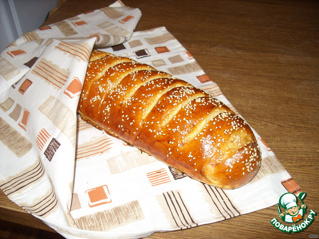 После этого на заготовке делаем поперечные надрезы, смазываем заготовку взбитым желтком с 1 ст. л. воды, посыпаем белым кунжутом.