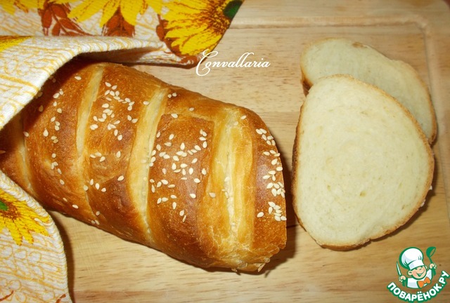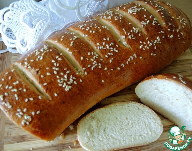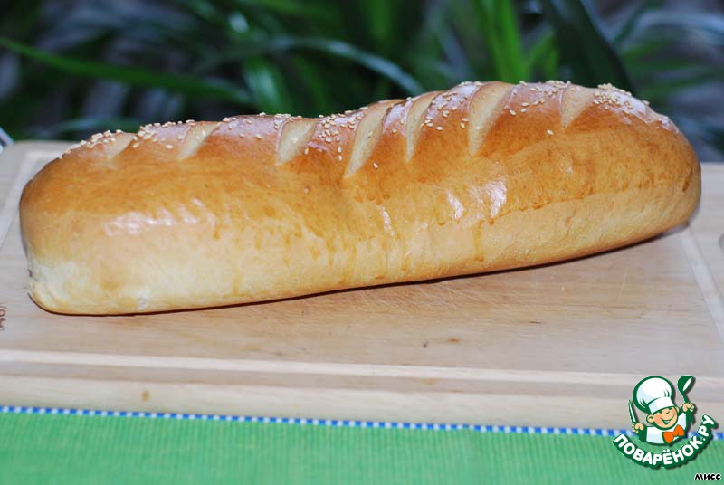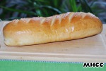Я все осваиваю свою хлебопечку. Но тесто также можно замесить и обычным способом. Мягкий воздушный мякиш, а корочка батона получилась тонкой и хрустящей. Угощайтесь на здоровье! Рецепт с сайта "Хлебопечка ".
