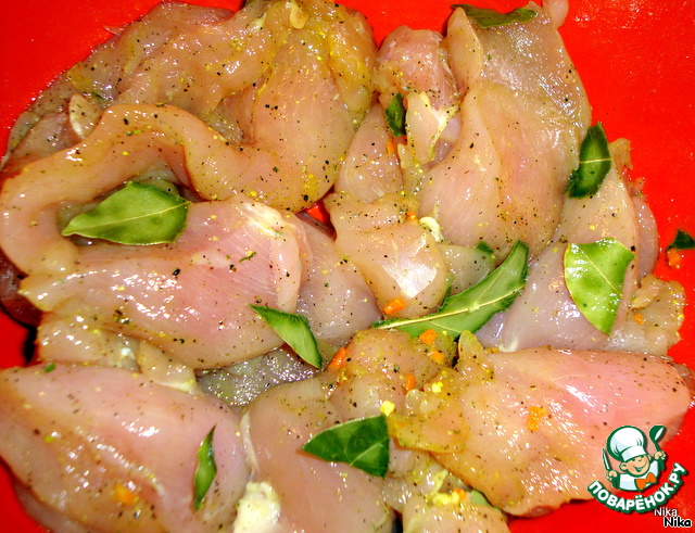 Куриное мясо порезать на одинаковые кусочки. В половину стакана добавить две ложки уксуса, одну ложку сах. песка, две ч. ложки соли, шашлычные специи, лавровый лист и вылить в мясо. Убрать в холодильник на ночь.