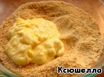 Размягченное масло взбиваем до кремообразного состояния и добавляем к крошке. Смешиваем хорошо руками. Крошка должна легко слепливаться в комки.