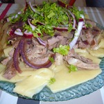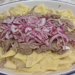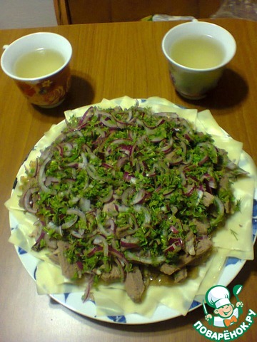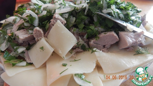 Сегодня сын заказал вкусное блюдо, и я даже не на секунду не задумываясь решила приготовить бешбармак. Много кривотолков ходит около этого блюда, кто-то готовит его из говядины, кто-то из конины, из баранины, горцы добавляют казы (колбаса из конины), даже называют его по разному - Беспармак, бишбармак - в переводе означает 5 пальцев, т. к. кушают его руками, это любимое национальное блюдо казахов и киргизов, и не только... Его можно попробовать в любом восточном ресторане, но так, как делают дома, не угостят нигде!!! Предлагаю и вам познакомится с этим вкусным блюдом, сын уплетал за обе щеки, а после ужина пришла свекровь с блокнотом и записала рецепт. Для меня это лучшая похвала!!!