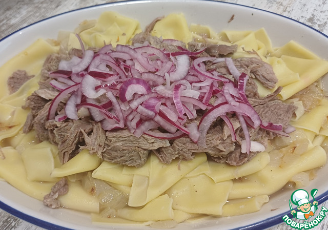 Мы делаем подругому из утки или говядины. Отвариваем мясо и в сурпе отвариваем тесто но его ненарезают и не подсушивают у нас его расскатывают в тонкий круглый пласт. Лук нарезанный полу кольцами заливаем горячей сурпой на 10мин. На бОльшое блудо не сильно глубокое выкладываем отварное тесто в середину мясо нарезанное кусочками и поливаем луком с сурпой. Некоторые ещё отварной картофель выклалывают по кругу. Вот так у нас в Кустанае делают...