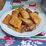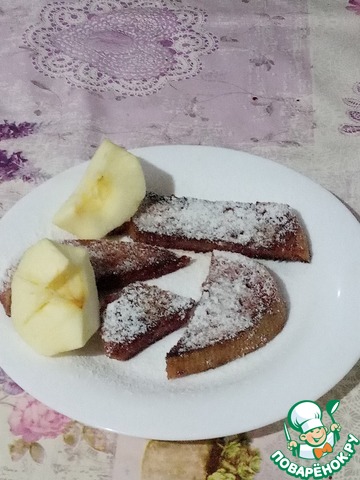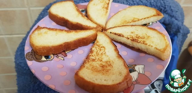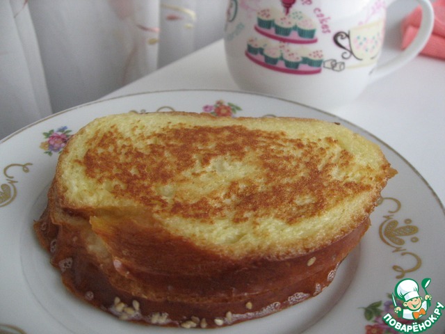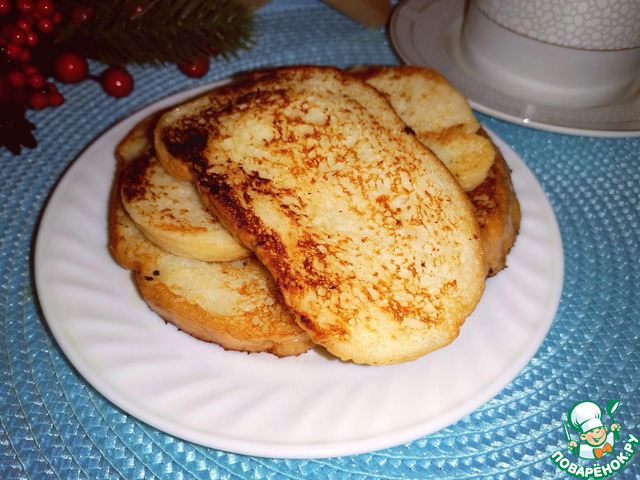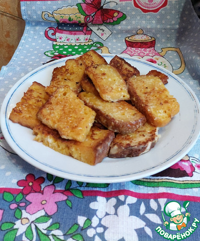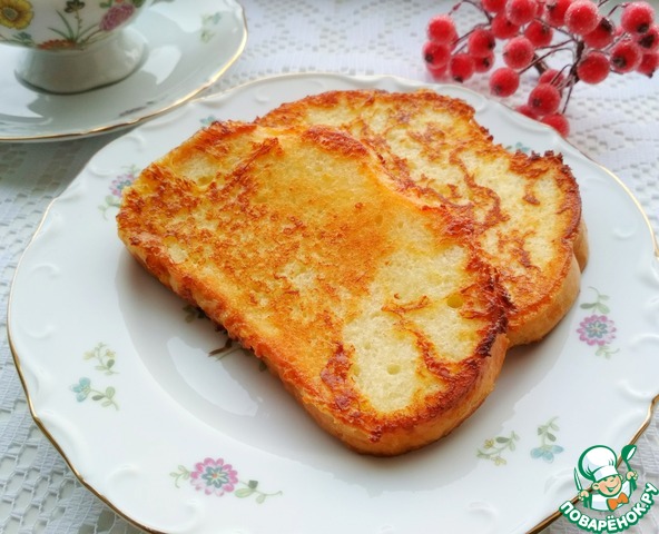 Окунуть батон в яично-молочную смесь и обжарить на растительном масле до образования золотистой корочки