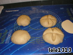 Каждую часть опять разделить на 4 части. Отложить небольшой кусочек, отщипывая от 16 частей тесто, чтобы впоследствии приделать небольшие шарики на булочки.