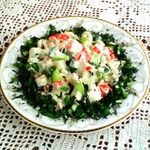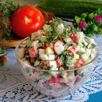 И снова наши, всеми любимые (а может, и не всеми) крабовые палочки в новом исполнении (а может, и не в новом)... Салат до безобразия прост, готовится на раз-два, с йогуртовым соусом (данным в рецепте) получается очень лeгкий, но любителям майонеза не запрещается заправить его чем?!... правильно, майо... (только тссс... никому не говорите... )