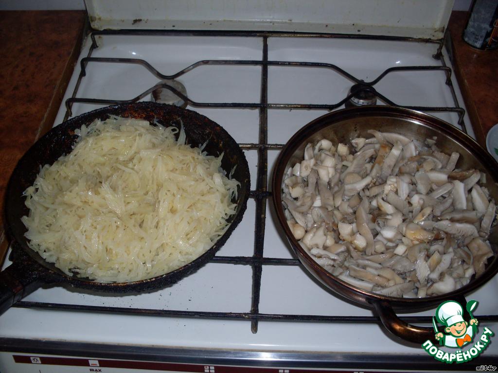 • Тушим капусту и параллельно жарим грибы...