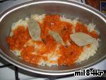 Первым слоем кладем грибы, потом рис, капусту, зажарку (всего по половине) и сверху кладем лавровый лист и перец...