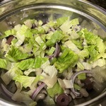 • Поливаем наш салат оливковым (растительным) маслом, солим и всё тщательно перемешиваем.