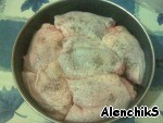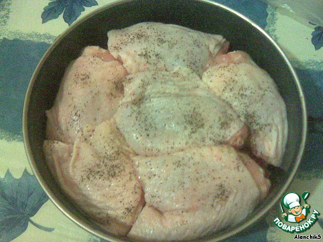 Сверху укладываем мясо (Я взяла куриные бедра, но можно брать любую часть). Солим, перчим. Извините за плохое качество фото, фотоаппарат разрядился, перешла на телефон.