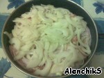 Лук режем полукольцами. Половину выкладываем на дно глубокого сотейника или казанка (ни масло, ни воду на дно наливать не нужно).