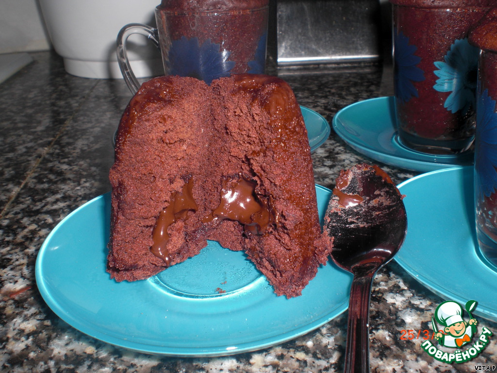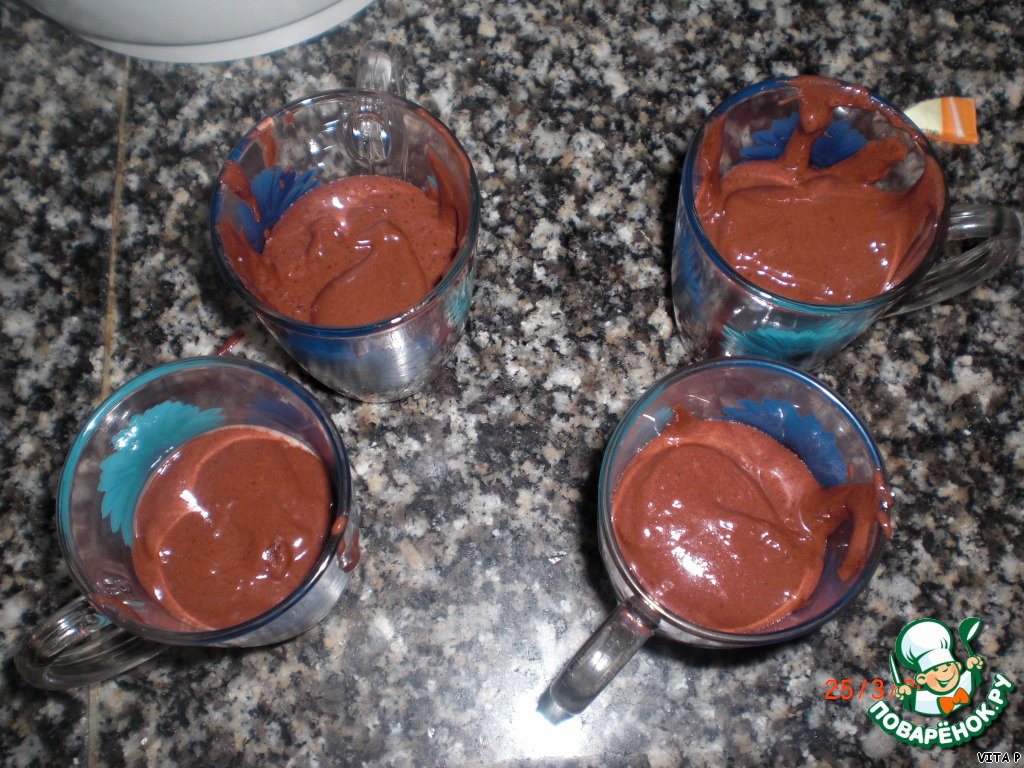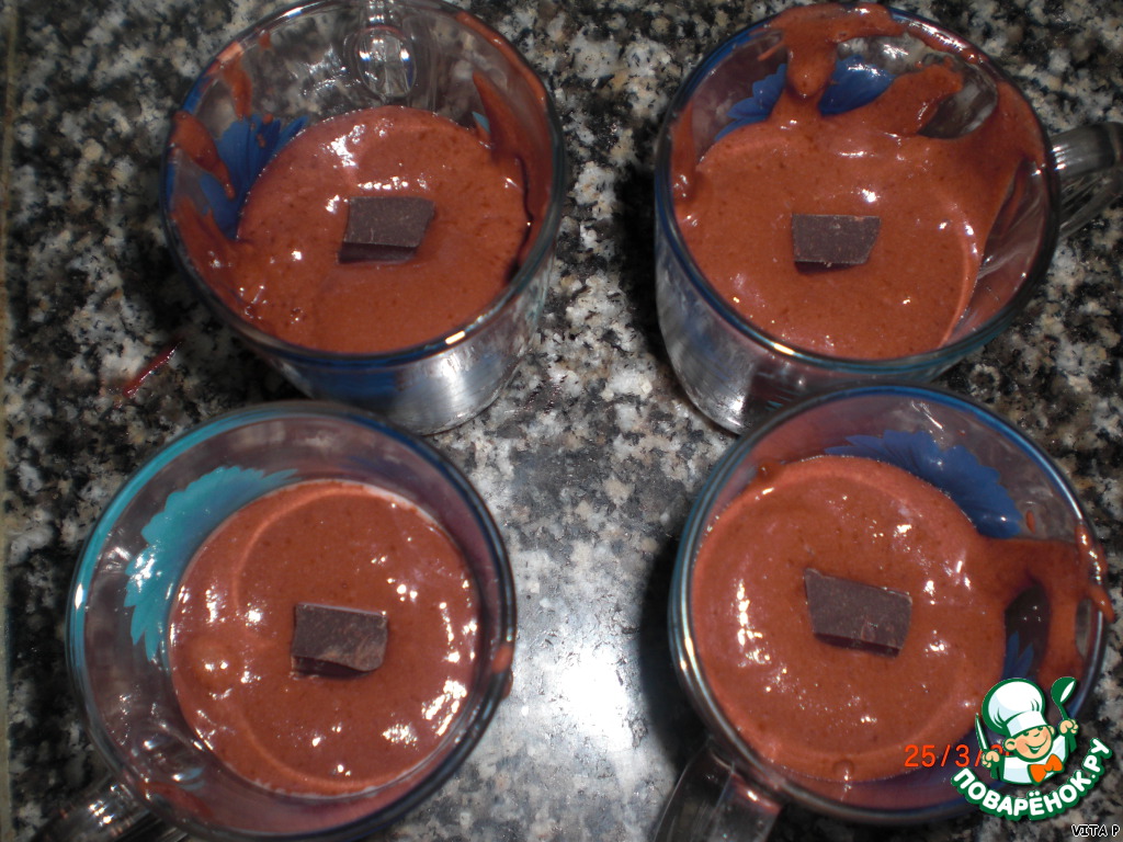 • Все ингредиенты тщательно размешать, кроме шоколада, тесто должно быть жидковатым, можно добавить ещё малость молока, будет нежней. Разложить в кофейные чашки (100-150 мл.) до половины. Можно иобычную 200 граммовую чашку только получится 3 порции.