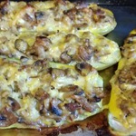 Поставить наполненные половинки в смазанную маслом сковороду, сверху посыпать тертым сыром. Запечь в духовке при 180*С в течение 30 минут.