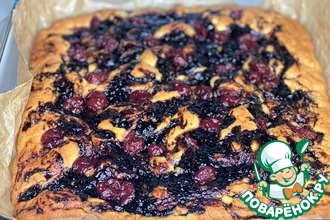Достаем вторую часть теста, раскатываем на плёнке прямоугольник немного больший по размеру и переносим на пирог.Бортики предварительно смазываем яйцом. Обрезаем излишки и хорошо придавливаем края.Из обрезков теста делаем какое нибудь украшение, смазываем яйцом и запекаем примерно 15-20 мин.