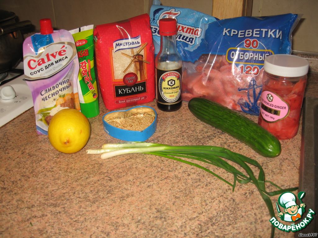 Кладем нори, на 2/3 его рис (не забываем смачивать немного руки в лимонной воде), семгу, ломтик огурца, креветки, лук, сверху смазываем все сливочно-чесночным Кальве, скручиваем ролл и оставляем минут 10 полежать. Нарезаем, смачивая ножик в лимонной воде, украшаем кунжутом и имбирем! Все! Быстро и вкусно! -