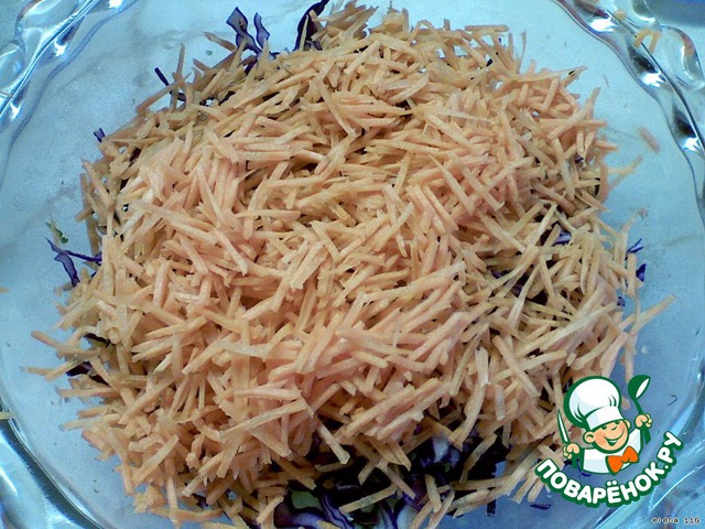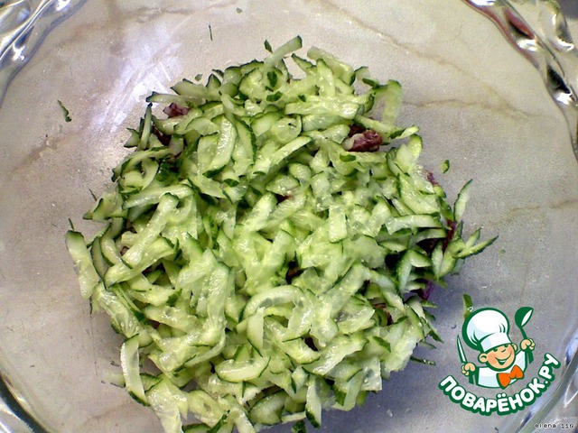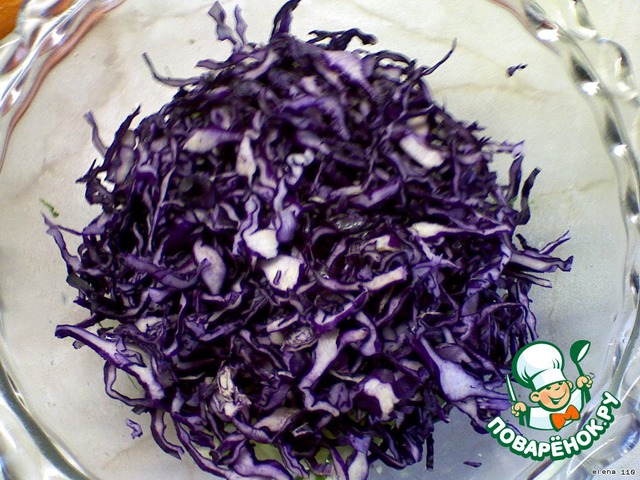 Капусту мелко нашинковать и помять хорошенечко руками.